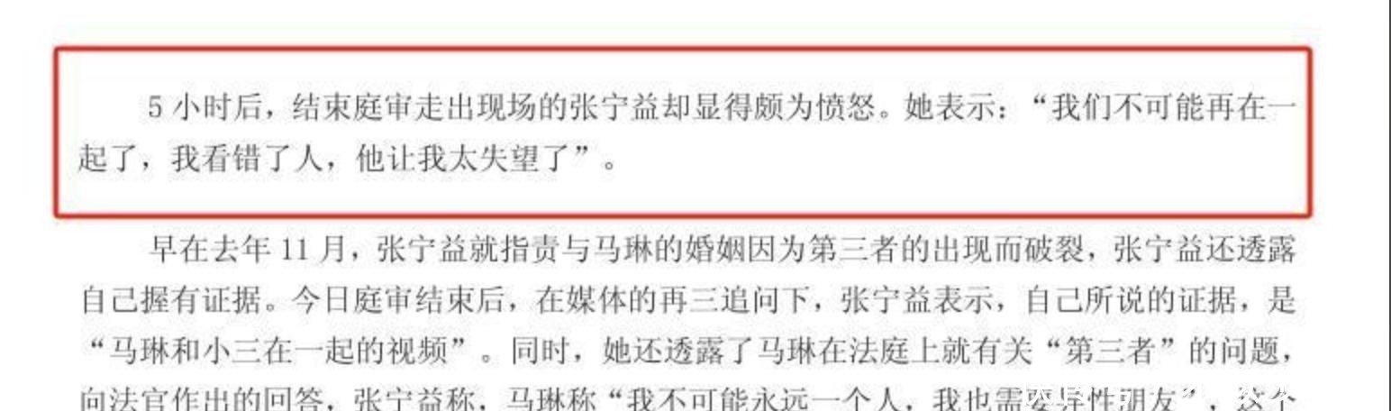 2009年,分居满一年后,马琳正式向法院递交离婚申请。消息传出当日,各大门户网站头条刷屏,连张宁益本人也坦言“完全措手不及”。